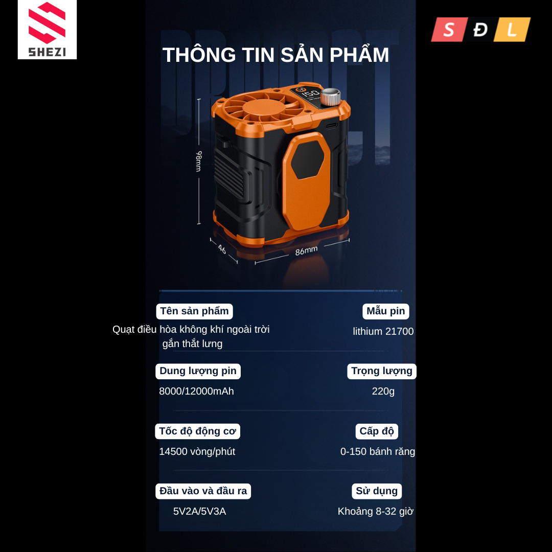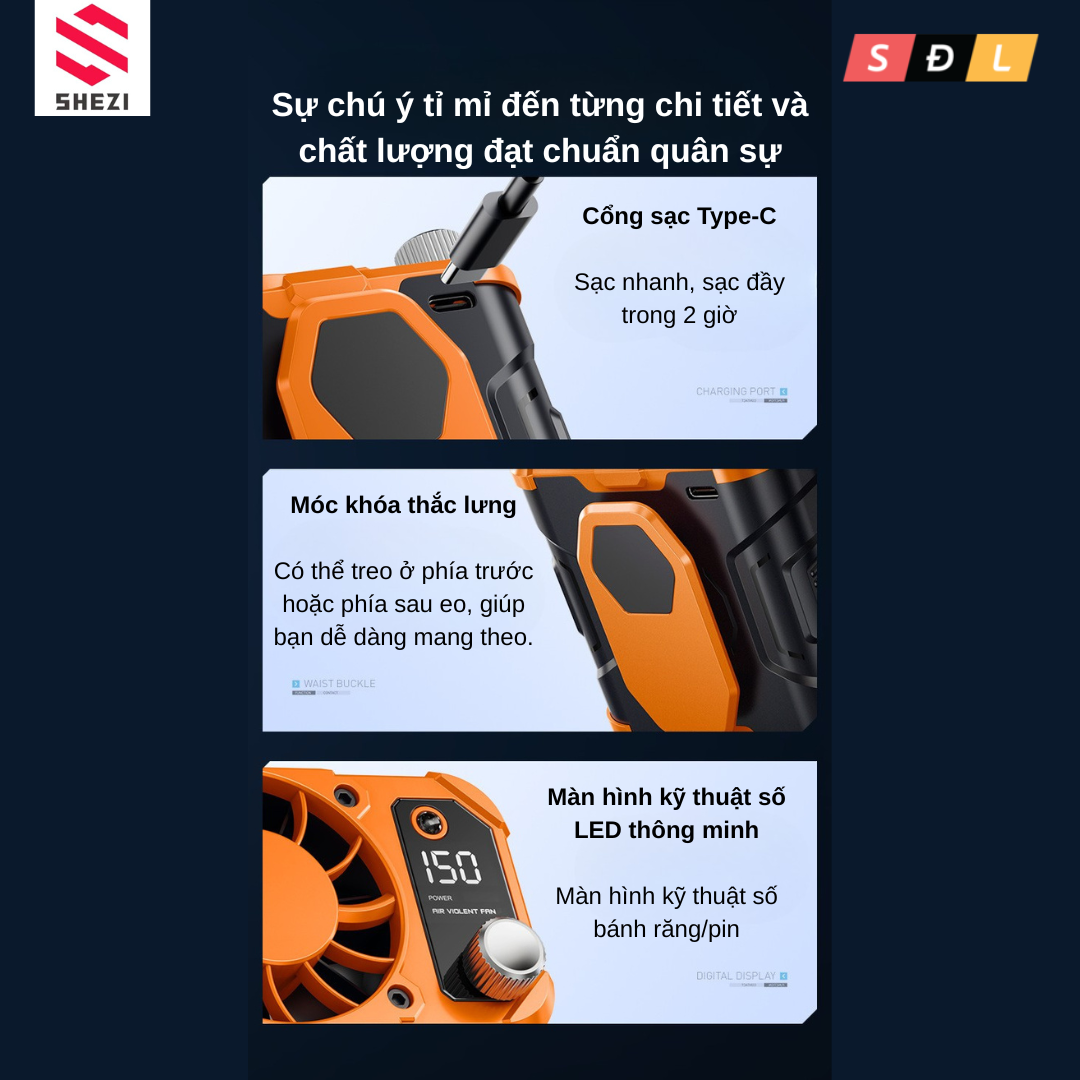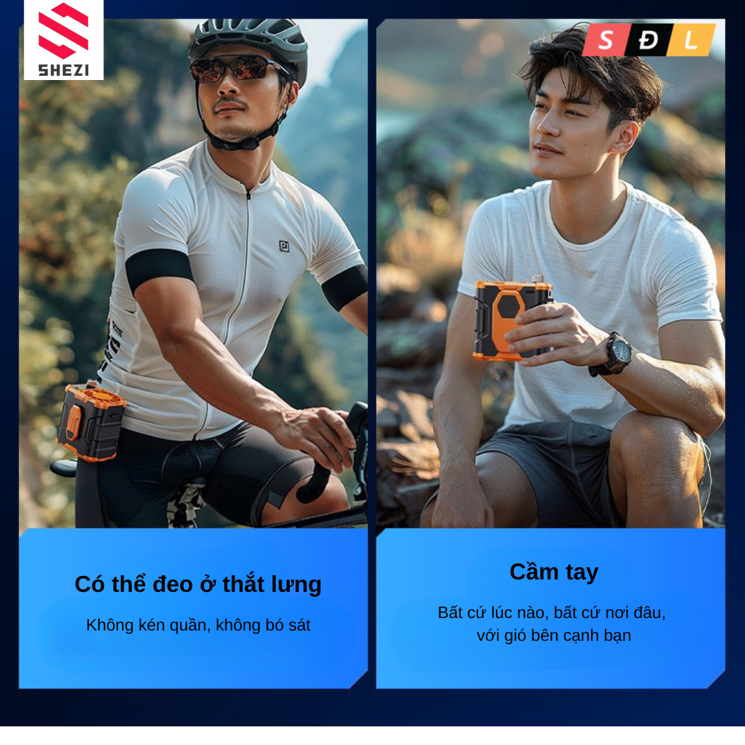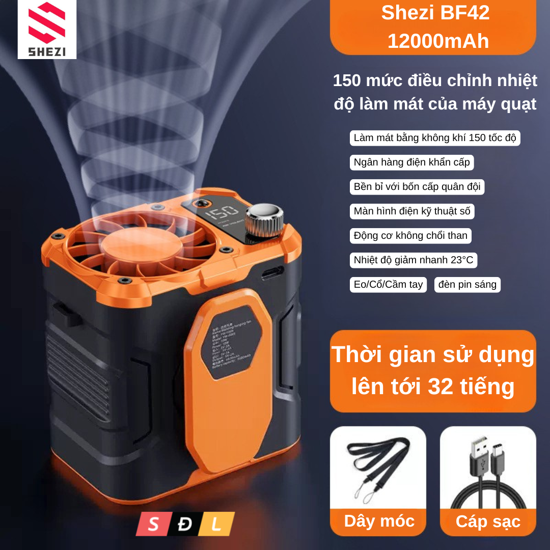 Quạt đeo hông ngoài trời công suất lớn Shezi BF42 với 150 cấp độ gió với lõi pin 21700 sịn sò